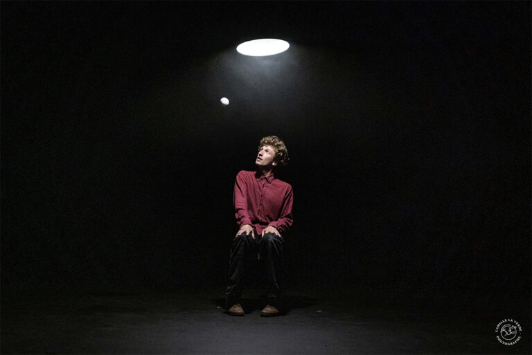 Sur scène, une lampe, une balle blanche, un chandelier, des allumettes, une enceinte qui diffuse un tango rétro… Léo Rousselet joue avec l’ombre, le temps, la lumière et la balle pour créer des moments de suspension qui varient en rythme, se décalent et se transforment comme par magie.